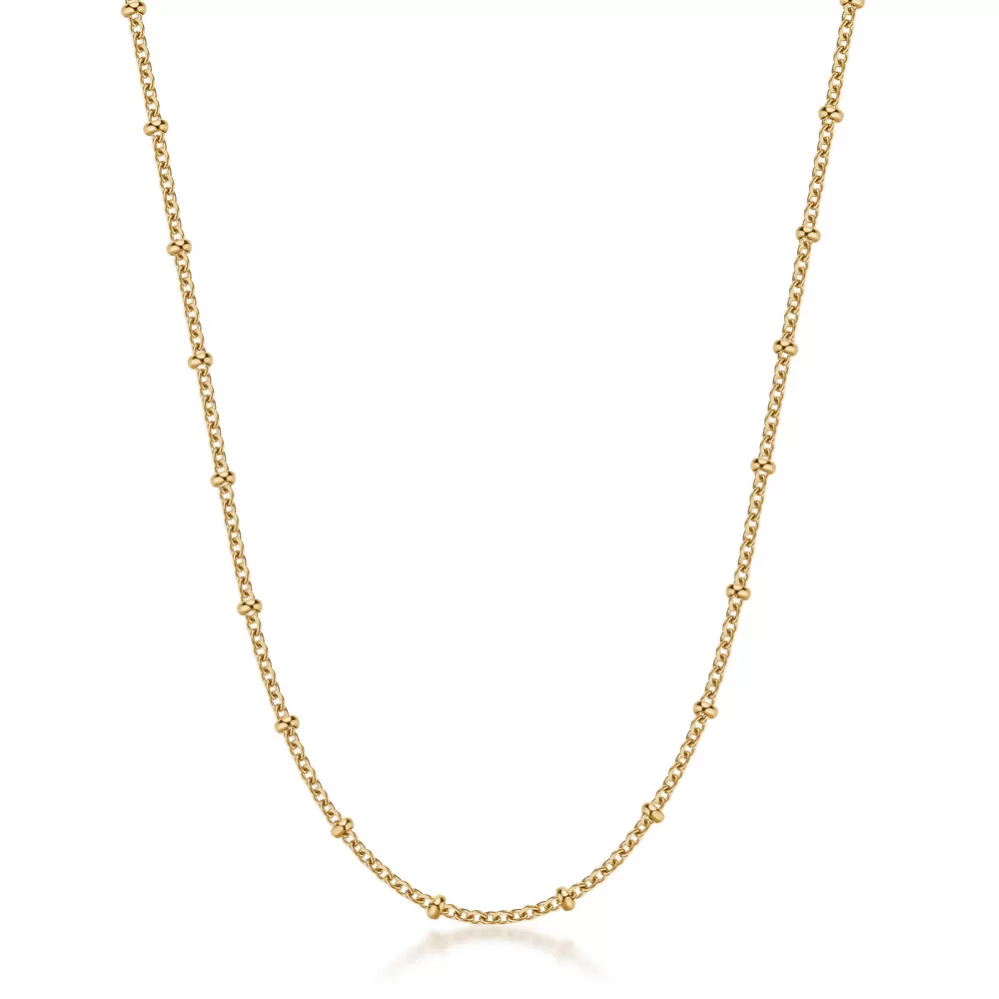 Dámska oceľová retiazka je ošetrená PVD povrchovou úpravou vo farbe žltého zlata. Retiazka je zdobená jemnými guličkami, ktoré zvýraznia jeho jemný dizajn. Retiazka je precízne spracovaná tak, aby zvládla prezentovať akýkoľvek prívesok. Dĺžka tejto oceľovej retiazky je 56 cm.