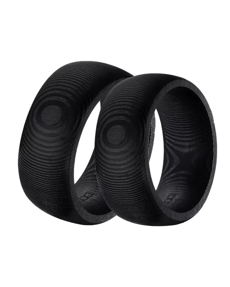 Prsteny jsou karbonové s matným vrstveným reliéfem. Prsteny mají vnitřní Fit profil - zaoblenou vnitřní plochu pro příjemnější nošení, nasazování a sundavání.  Karbon je Hi-tech materiál z uhlíkových vláken, který se používá v mnoha průmyslových a designových odvětvích nevyjímaje šperkařství.