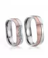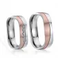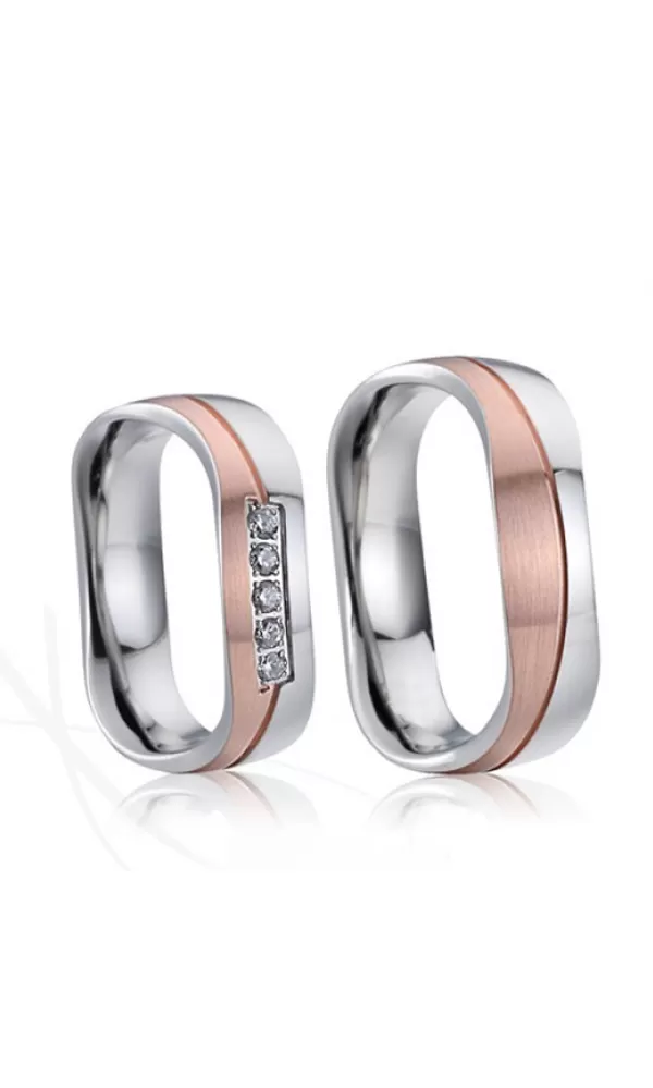 Zaujímavé oceľové snubné prstene rovného profilu s kombinovanou povrchovou úpravou lesk - zamatový mat. Polovica je matná s ružovým PVD pozlátením a polovica je lesklá, uprostred oddelené jemnou ryhou. V dámskom prsteni je vsadené do obdĺžnika 5 okrúhlych zirkónov s briliantovým brusom Signity star, ktorý dodáva zirkónom maximálnu brilanciu. Prstene majú vnútorný fit profil - zaoblenú vnútornú stranu pre príjemnejšie nosenie, nasadzovanie a odnímanie.