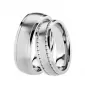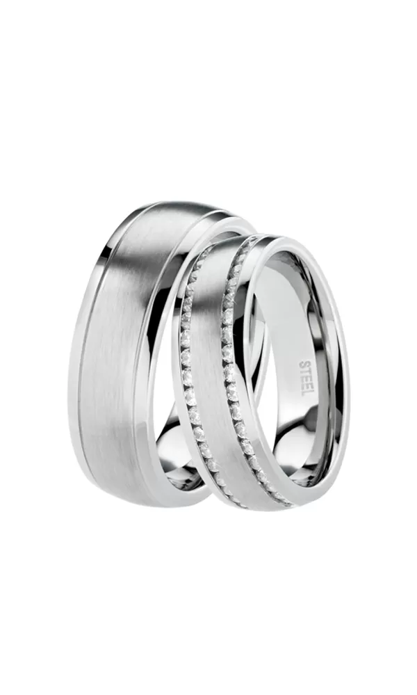 Snubné prstene z chirurgickej ocele v mierne polguľatom profile s kombinovanou povrchovou úpravou zamatový mat – lesk, kedy lesklé prúžky na krajoch sú oddelené jemnými ryhami.  V dámskom prsteni sú po obvode vsadené zirkóny v dvoch radoch s briliantovým brusom Signity star, ktorý dodáva zirkónom maximálnu brilanciu. Prstene majú vnútorný fit profil - zaoblenú vnútornú stranu pre príjemnejšie nosenie, nasadzovanie a odnímanie.