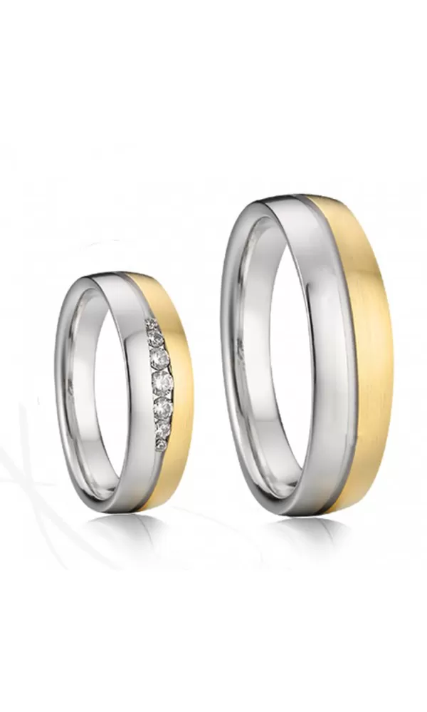 Krásne oceľové snubné prstene mierne polguľatého profilu s kombinovanou povrchovou úpravou lesk - zamatový mat. Polovica je matná s PVD pozlátením a polovica je lesklá, uprostred oddelené jemnou ryhou. V dámskom prsteni je vsadených 7 okrúhlych zirkónov s briliantovým brusom Signity star, ktorý dodáva zirkónom maximálnu brilanciu. Prstene majú vnútorný fit profil - zaoblenú vnútornú stranu pre príjemnejšie nosenie, nasadzovanie a odnímanie.