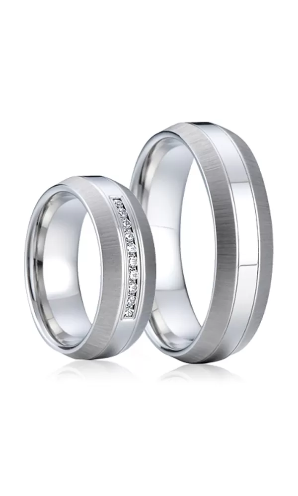 Krásne široké snubné prstene rovného profilu so strhnutými krajnými časťami vyrobené z chirurgickej ocele s kombinovanou povrchovou úpravou lesk - "čiarkovaný" mat. V dámskom prsteni je vsadených desať okrúhlych zirkónov s briliantovým brusom Signity star, ktorý dodáva zirkónom maximálnu brilanciu. Prstene majú vnútorný fit profil - zaoblenú vnútornú stranu pre príjemnejšie nosenie, nasadzovanie a odnímanie.