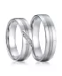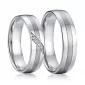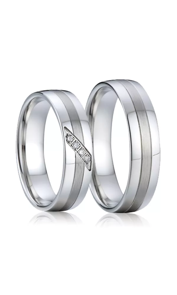 Moderné široké oceľové snubné prstene pologuľatého profilu s kombinovanou povrchovou úpravou lesk - zamatový mat, ktorý od seba delí jemné ryhy. V dámskom prsteni sú vsadené štyri okrúhle zirkóny s briliantovým brusom Signity star, ktorý dodáva zirkónom maximálnu brilanciu. Prstene majú vnútorný fit profil - zaoblenú vnútornú stranu pre príjemnejšie nosenie, nasadzovanie a odnímanie.