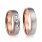 Elegantné oceľové snubné prstene mierne polguľatého profilu s matnou povrchovou úpravou. Prstene sú matné s lesklou PVD povrchovou úpravou vo farbe ružového zlata na kraji a vo vnútri, ktoré je oddelené jemnou ryhou. V dámskom prsteni sú vsadené 3 okrúhle zirkóny s briliantovým brusom Signity star, ktorý dodáva zirkónom maximálnu brilanciu. Prstene majú vnútorný fit profil - zaoblenú vnútornú stranu pre príjemnejšie nosenie, nasadzovanie a odnímanie.
