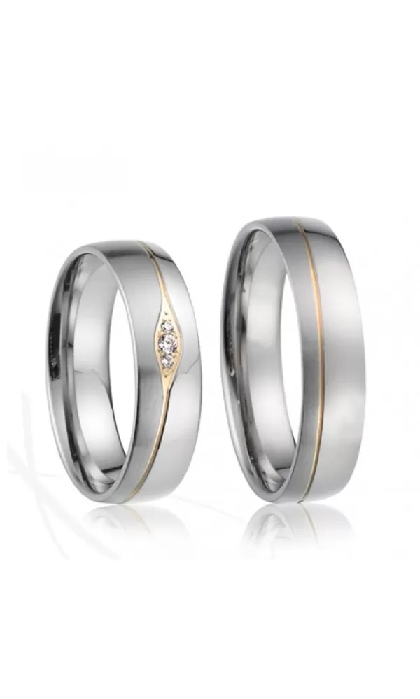 Elegantné oceľové snubné prstene mierne polguľatého profilu s kombinovanou povrchovou úpravou lesk - zamatový mat, ktorý od seba oddeľuje jemná pozlátená ryha. majú vnútorný fit profil - zaoblenú vnútornú stranu pre príjemnejšie nosenie, nasadzovanie a odnímanie.
