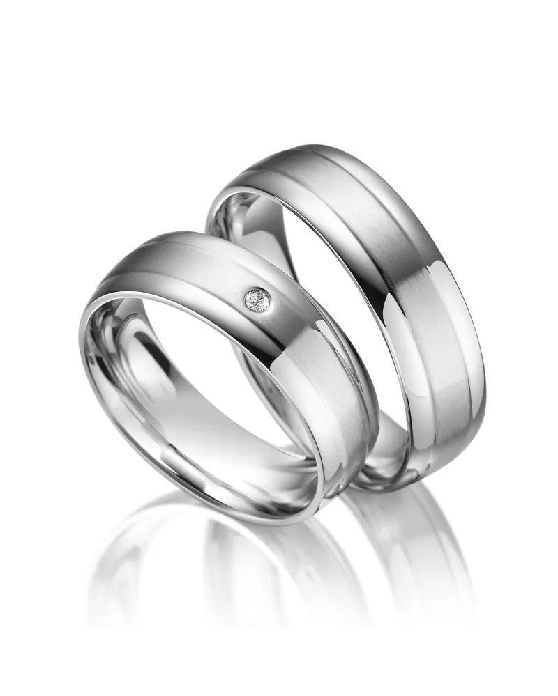 Moderné oceľové snubné prstene mierne polguľatého profilu po krajoch as rovným stredom. Prstene zdobí kombinovaná povrchová úprava lesk - zamatový mat, kedy lesklé sú kraje a matný je stred prsteňa. V dámskom prsteni je vsadený jeden žiarivý okrúhly zirkón s briliantovým brusom Signity star, ktorý dodáva zirkónu maximálnu brilanciu. Prstene majú vnútorný fit profil - zaoblenú vnútornú stranu pre príjemnejšie nosenie, nasadzovanie a odnímanie.
