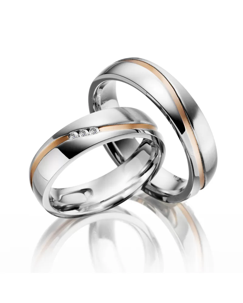 Oceľové snubné prstene mierne polguľatého profilu v kombinácii lesklej a matnej povrchovej úpravy, ktoré sú od seba rozdelené matnou pozlátenou vlnkou, ktorá je pozlátená technológiou PVD. brusom Signity star, ktorý dodáva zirkónom maximálnu brilanciu. Prstene majú vnútorný fit profil - zaoblenú vnútornú stranu pre príjemnejšie nosenie. Prstene majú vnútorný fit profil - zaoblenú vnútornú stranu pre príjemnejšie nosenie, nasadzovanie a odnímanie.