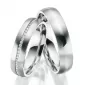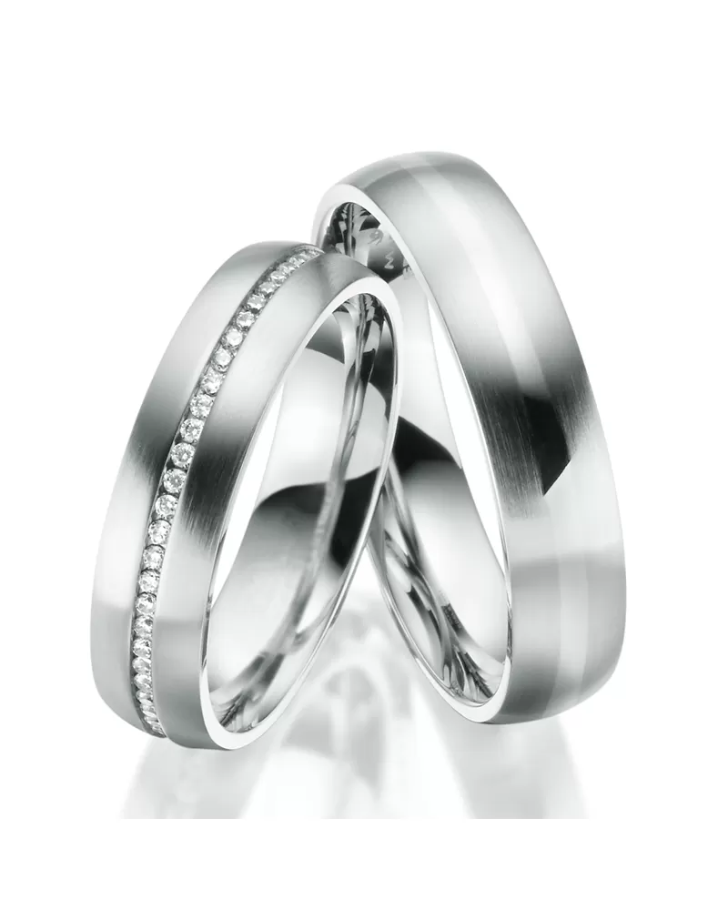 Pánský snubní prsten je v matné povrchové úpravě a zdobí ho střední proužek leštěný do vysokého lesku. Dámský prsten má místo proužku sníženou vlnku, ve které jsou vsazeny zirkony. Zirkony jsou v briliantovém brusu Signity star, který dodává zirkonům maximální brilanci. Snubní prsteny mají vnitřní Fit Profil – půlkulatou vnitřní stranu pro příjemnější nošení, nasazování a sundávání.