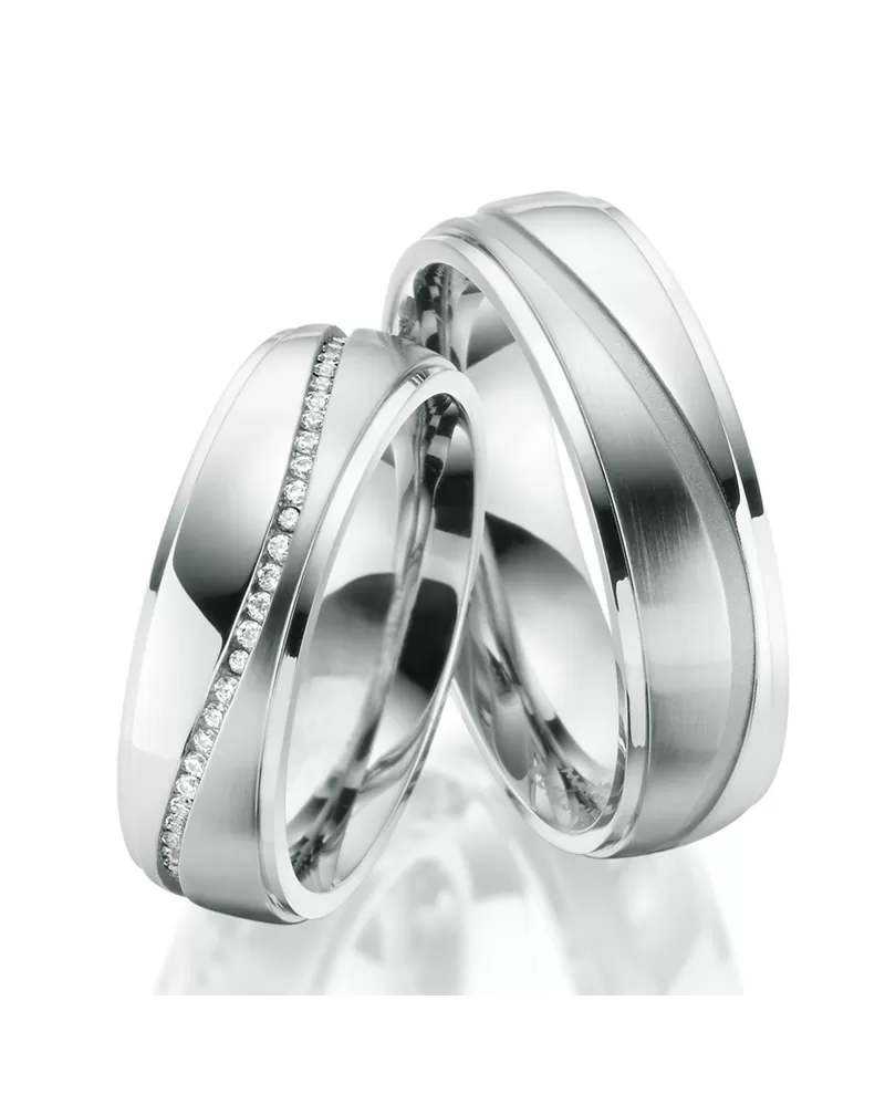 Pánský snubní prsten je v kombinaci lesklé a matné povrchové úpravě se sníženými kraji a sníženou vlnkou. Dámský prsten má ve snížené vlnce vsazeny zirkony. Zirkony jsou v briliantovém brusu Signity star, který dodává zirkonům maximální brilanci. Snubní prsteny mají vnitřní Fit Profil – půlkulatou vnitřní stranu pro příjemnější nošení, nasazování a sundávání.