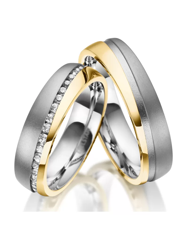 Pánský prsten je rozdělen na dvě části sníženou šikmou linkou, který je zvýrazněna pískováním. Tato linka rozděluje prsten na lesklou zlacenou část a na část v matné povrchové úpravě. Dámský prsten má v šikmé snížené lince vsazeny zirkony. Zirkon je v briliantovém brusu Signity star, který dodává zirkonům maximální brilanci. Snubní prsteny mají vnitřní Fit Profil – půlkulatou vnitřní stranu pro příjemnější nošení, nasazování a sundávání.