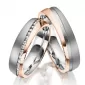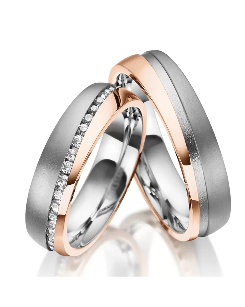 Pánský prsten je rozdělen na dvě části sníženou šikmou linkou, který je zvýrazněna pískováním. Tato linka rozděluje prsten na lesklou zlacenou část a na část v matné povrchové úpravě. Dámský prsten má v šikmé snížené lince vsazeny zirkony. Zirkon je v briliantovém brusu Signity star, který dodává zirkonům maximální brilanci. Snubní prsteny mají vnitřní Fit Profil – půlkulatou vnitřní stranu pro příjemnější nošení, nasazování a sundávání.