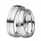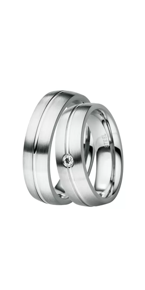 Snubné prstene z chirurgickej ocele v mierne polguľatom profile s kombinovanou povrchovou úpravou lesk - zamatový mat, kedy je uprostred lesklý prúžok.  V dámskom prsteni je vsadený jeden okrúhly zirkón s briliantovým brusom Signity star, ktorý dodáva zirkónom maximálnu brilanciu. Prstene majú vnútorný fit profil - zaoblenú vnútornú stranu pre príjemnejšie nosenie, nasadzovanie a odnímanie.