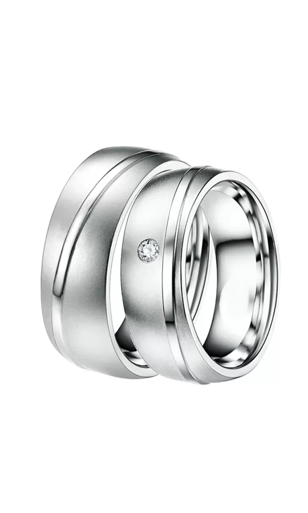 Snubné prstene z chirurgickej ocele v mierne polguľatom profile s kombinovanou povrchovou úpravou lesk - zamatový mat, kedy je po obvode lesklá vlnovka.  V dámskom prsteni je vsadený jeden okrúhly zirkón s briliantovým brusom Signity star, ktorý dodáva zirkónom maximálnu brilanciu. Prstene majú vnútorný fit profil - zaoblenú vnútornú stranu pre príjemnejšie nosenie, nasadzovanie a odnímanie.
