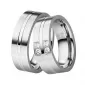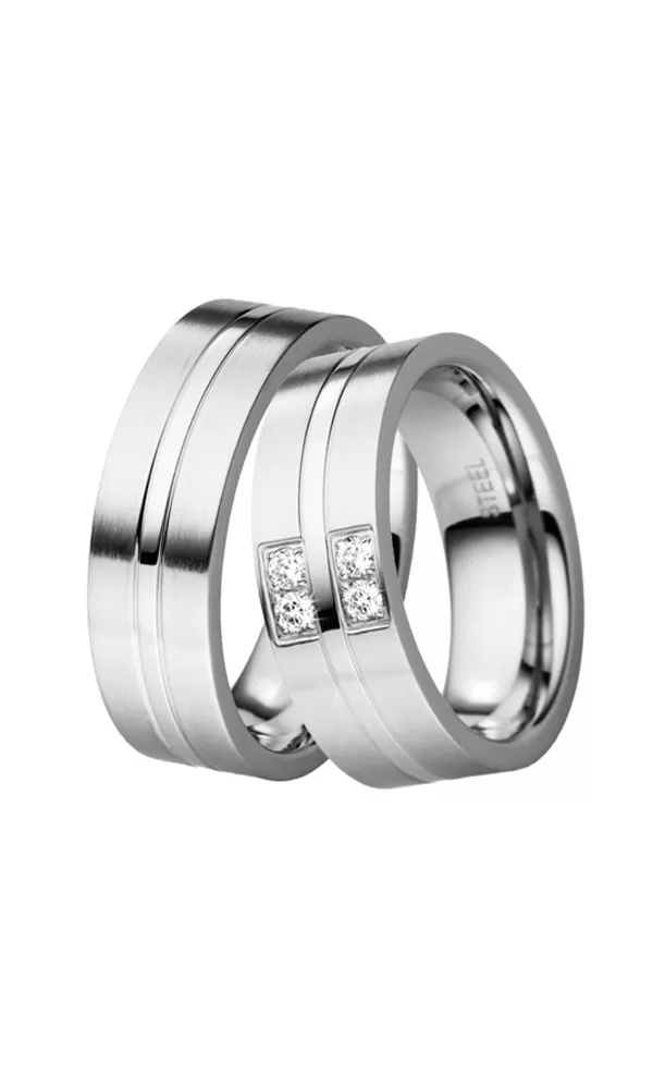 Snubné prstene z chirurgickej ocele v mierne polguľatom profile s kombinovanou povrchovou úpravou lesk - zamatový mat, kedy je lesklá časť uprostred oddelená jemnými ryhami.  V dámskom prsteni sú vsadené do štvorčeka štyri okrúhle zirkóny s briliantovým brusom Signity star, ktorý dodáva zirkónom maximálnu brilanciu. Prstene majú vnútorný fit profil - zaoblenú vnútornú stranu pre príjemnejšie nosenie, nasadzovanie a odnímanie.