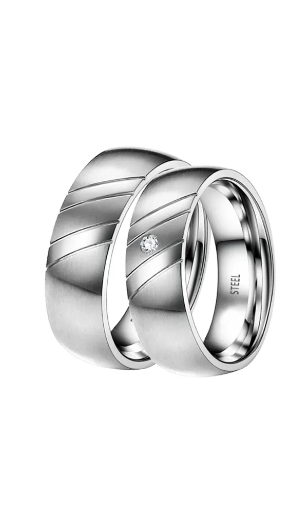 Snubné prstene z chirurgickej ocele v mierne polguľatom profile s kombinovanou povrchovou úpravou lesk - zamatový mat, kedy sú lesklé prúžky oddelené jemnými ryhami.  V dámskom prsteni je vsadený jeden okrúhly zirkón s briliantovým brusom Signity star, ktorý dodáva zirkónom maximálnu brilanciu. Prstene majú vnútorný fit profil - zaoblenú vnútornú stranu pre príjemnejšie nosenie, nasadzovanie a odnímanie.
