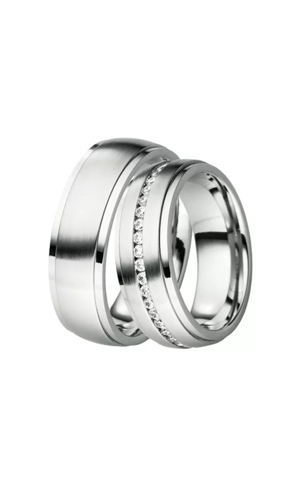 Snubné prstene z chirurgickej ocele v mierne polguľatom profile s kombinovanou povrchovou úpravou zamatový mat – lesk, kedy lesklé prúžky na krajoch sú oddelené jemnými ryhami.  V dámskom prsteni sú po obvode vsadené zirkóny, s briliantovým brusom Signity star, ktorý dodáva zirkónom maximálnu brilanciu, celkový počet sa líši podľa veľkosti prsteňa - cca 40ks. Prstene majú vnútorný fit profil - zaoblenú vnútornú stranu pre príjemnejšie nosenie, nasadzovanie a odnímanie.