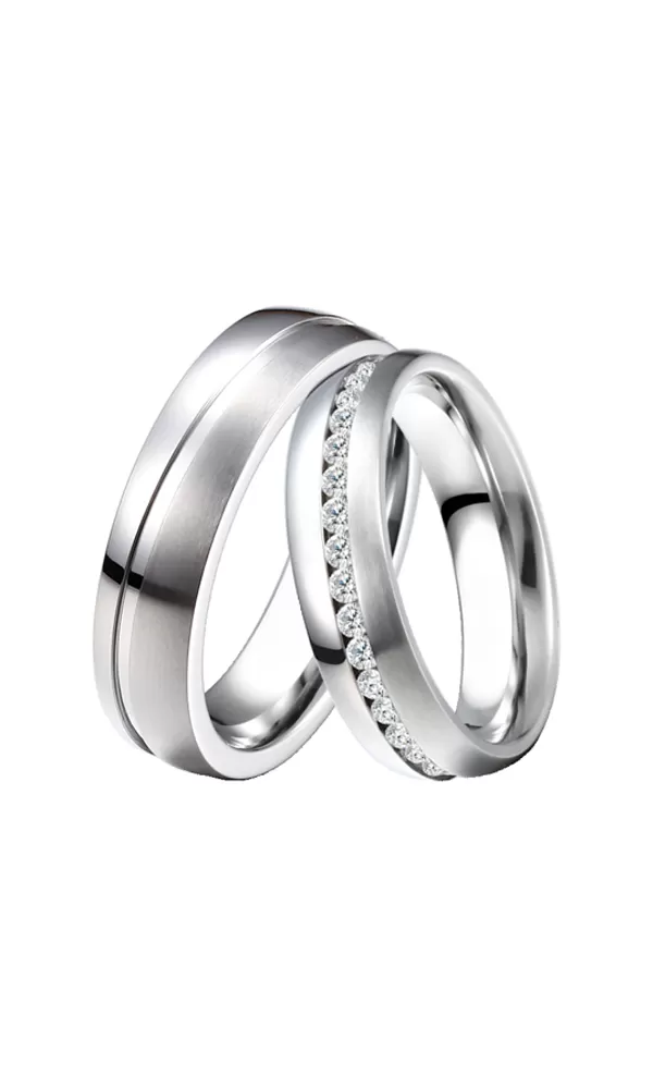 Snubné prstene z chirurgickej ocele v mierne polguľatom profile s kombinovanou povrchovou úpravou zamatový mat – lesk. V dámskom prsteni sú po obvode vsadené zirkónmi s briliantovým brusom Signity star, ktorý dodáva zirkónom maximálnu brilanciu . Prstene majú vnútorný fit profil - zaoblenú vnútornú stranu pre príjemnejšie nosenie, nasadzovanie a odnímanie.