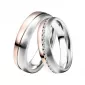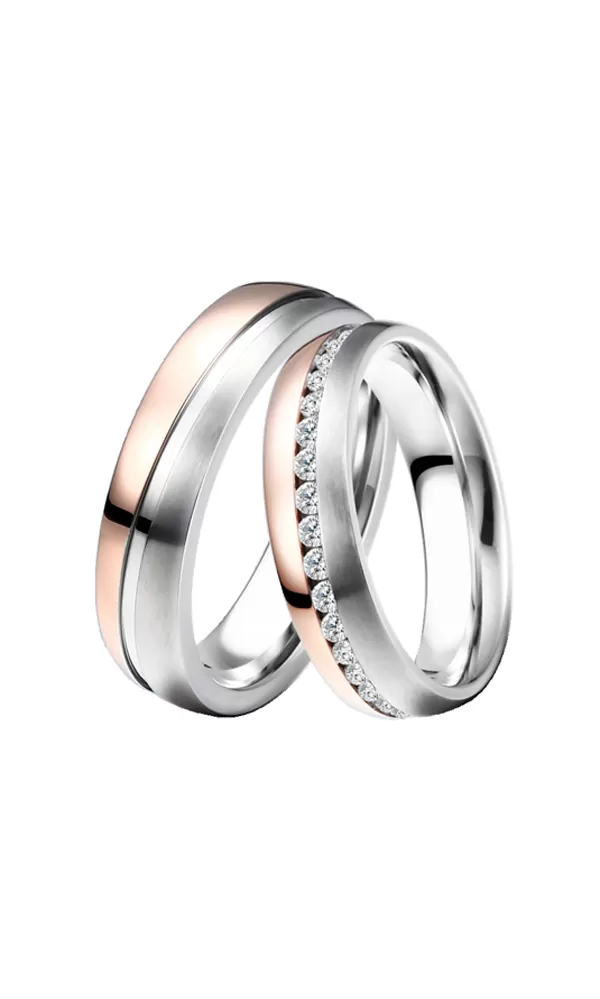 Snubné prstene z chirurgickej ocele v mierne polguľatom profile s kombinovanou povrchovou úpravou zamatový mat – lesk. Prstene sú s ružovým lesklým PVD pozlátením na kraji, ktoré je oddelené lesklou ryhou. V dámskom prsteni sú po obvode vsadené zirkóny s briliantovým brusom Signity star, ktorý dodáva zirkónom maximálnu brilanciu celkový počet sa líši podľa veľkosti prsteňa - cca 32ks. Prstene majú vnútorný fit profil - zaoblenú vnútornú stranu pre príjemnejšie nosenie, nasadzovanie a odnímanie.