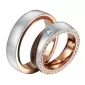 Luxusné snubné prstene vyrobené z chirurgickej ocele v mierne polguľatom profile. Prstene zdobí kombinovaná povrchová úprava lesk - zamatový mat, kedy lesklé sú boky s ružovým PVD pozlátením prsteňov a matná je celá vonkajšia časť. V dámskom prsteni je vsadený jeden okrúhly zirkón do štvorčeka o veľkosti 2,75 mm a na jednej bočnej strane sú vsadené malé zirkóny o veľkosti 1,00 mm po celom obvode s briliantovým brusom Signity star, ktorý dodáva zirkónom maximálnu brilanciu. Prstene majú vnútorný fit profil - zaoblenú vnútornú stranu pre príjemnejšie nosenie, nasadzovanie a odnímanie.