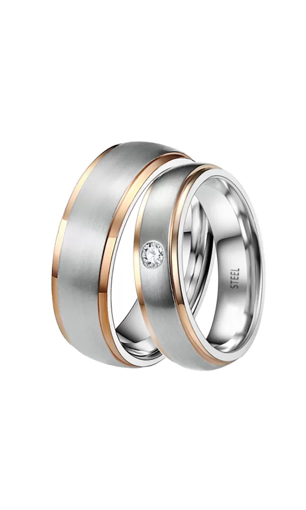 Snubné prstene z chirurgickej ocele v mierne polguľatom profile s kombinovanou povrchovou úpravou lesk - zamatový mat. Prstene sú matné s ružovým lesklým PVD pozlátením na krajoch. V dámskom prsteni je vsadený jeden okrúhly zirkón s briliantovým brusom Signity star, ktorý dodáva zirkónom maximálnu brilanciu. Prstene majú vnútorný fit profil - zaoblenú vnútornú stranu pre príjemnejšie nosenie, nasadzovanie a odnímanie.