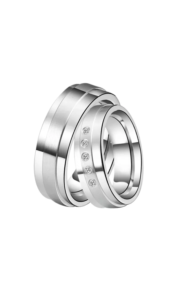 Snubné prstene z chirurgickej ocele v mierne polguľatom profile s kombinovanou povrchovou úpravou zamatový mat – lesk. Kedy matný prúžok uprostred je oddelený jemnými ryhami. V dámskom prsteni je vsadených päť okrúhlych zirkónov s briliantovým brusom Signity star, ktorý dodáva zirkónom maximálnu brilanciu. Prstene majú vnútorný fit profil - zaoblenú vnútornú stranu pre príjemnejšie nosenie, nasadzovanie a odnímanie.