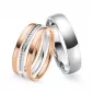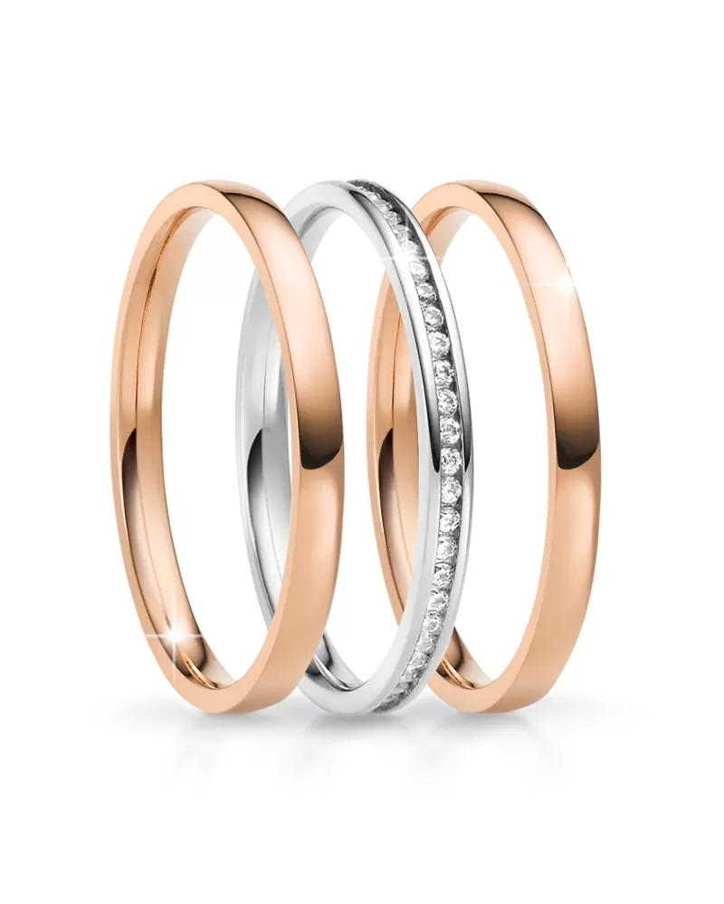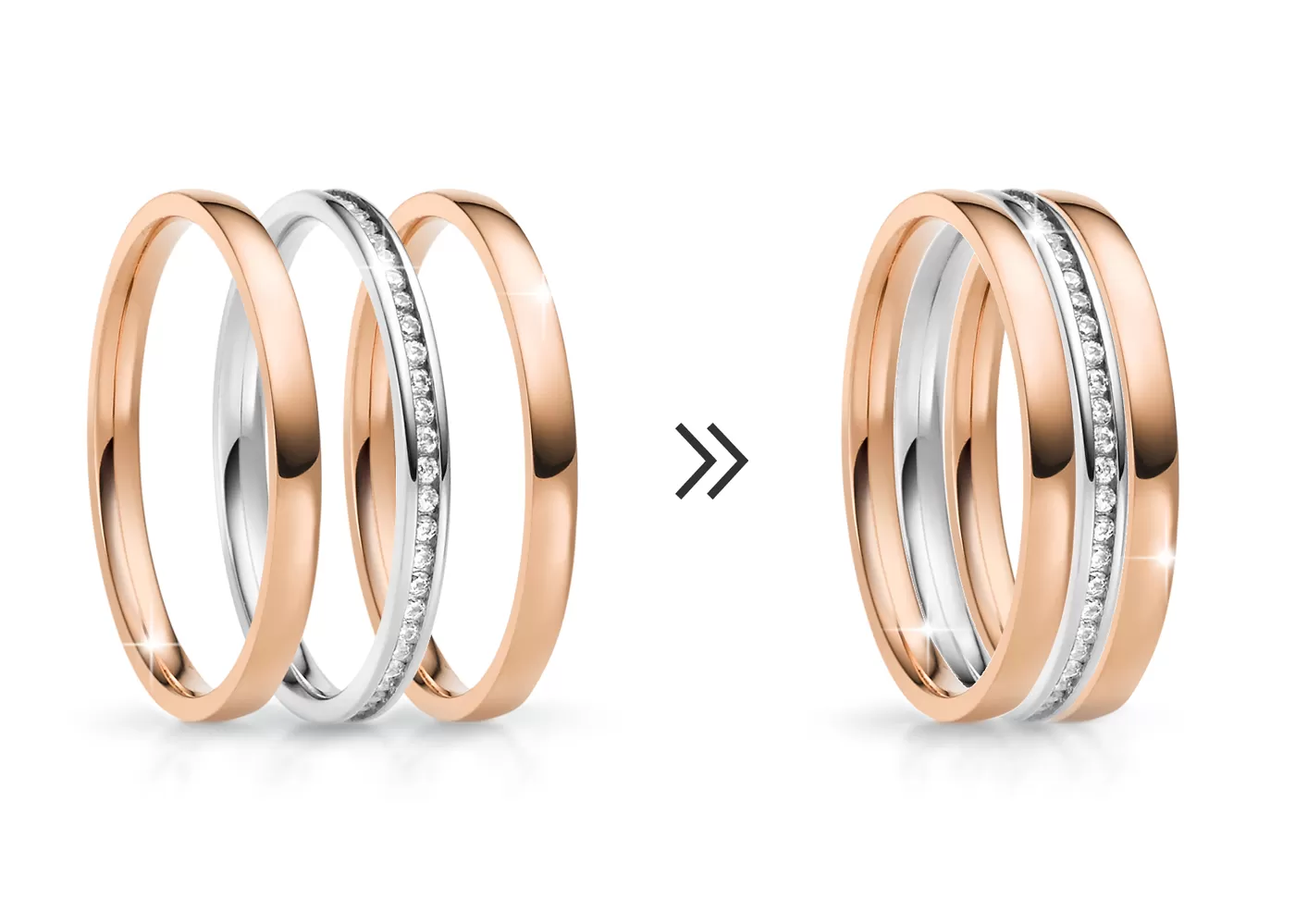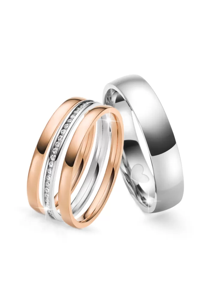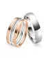 Moderní variabilní snubní prsteny jsou vyrobeny z chirurgické oceli v lesklé povrchové úpravě. Dámský prsten tvoří středový kroužek z růžového zlata se zirkony a dva bílé kroužky. Kroužky nejsou spojeny a tudíž je možno je různě prohazovat popř. nosit každý samostatně. Zirkony jsou vybroušeny briliantovým brusem Signity star, který dodává zirkonům maximální brilanci.