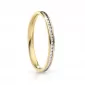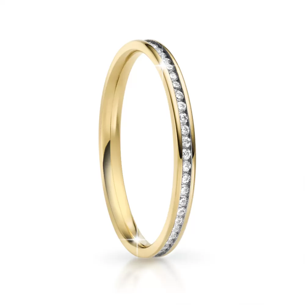 Snubní prsten v rovném profilu je vyroben z chirurgické oceli v lesklé povrchové úpravě. Prsten je zlacený v barvě žlutého zlata technologií PVD. Předností PVD zlacení je vysoká tvrdost a odolnost proti otěru. Jedná se o silnou vrstvu, která proniká do původního materiálu. PVD se dá srovnat s přibližně s 12 mikrony galvanického zlacení, což je vysoká kvalita, která při běžném nošení vydrží mnoho let. V prstenu jsou vsazeny kulaté zirkony. Zirkony jsou vybroušeny briliantovým brusem Signity star, který dodává zirkonům maximální brilanci. Snubní prsten má vnitřní Fit Profil – půlkulatou vnitřní stranu pro příjemnější nošení, nasazování a sundávání. Chirurgická ocel oplývá vynikajícími vlastnostmi, je velmi pevná, odolná a antialergická. To jistě mnoho z vás uvítá.