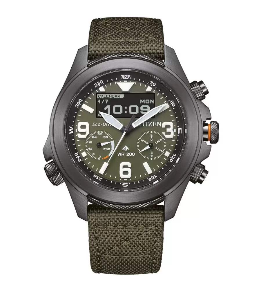 Citizen JV1 robustné pánske hodinky z radu Promaster Land, ktoré kombinujú klasický analógový ciferník s digitálnymi funkciami a sú navrhnuté na aktívne použitie aj každodenné nosenie. Sú poháňané technológiou Eco‑Drive, takže ich dobíja akékoľvek svetlo a batériu nie je potrebné meniť. zafírovým sklíčkom, ktoré výrazne zlepšuje čitateľnosť aj na slnku a zároveň je veľmi odolné voči poškriabaniu.