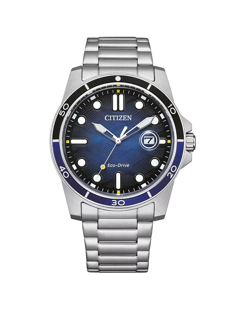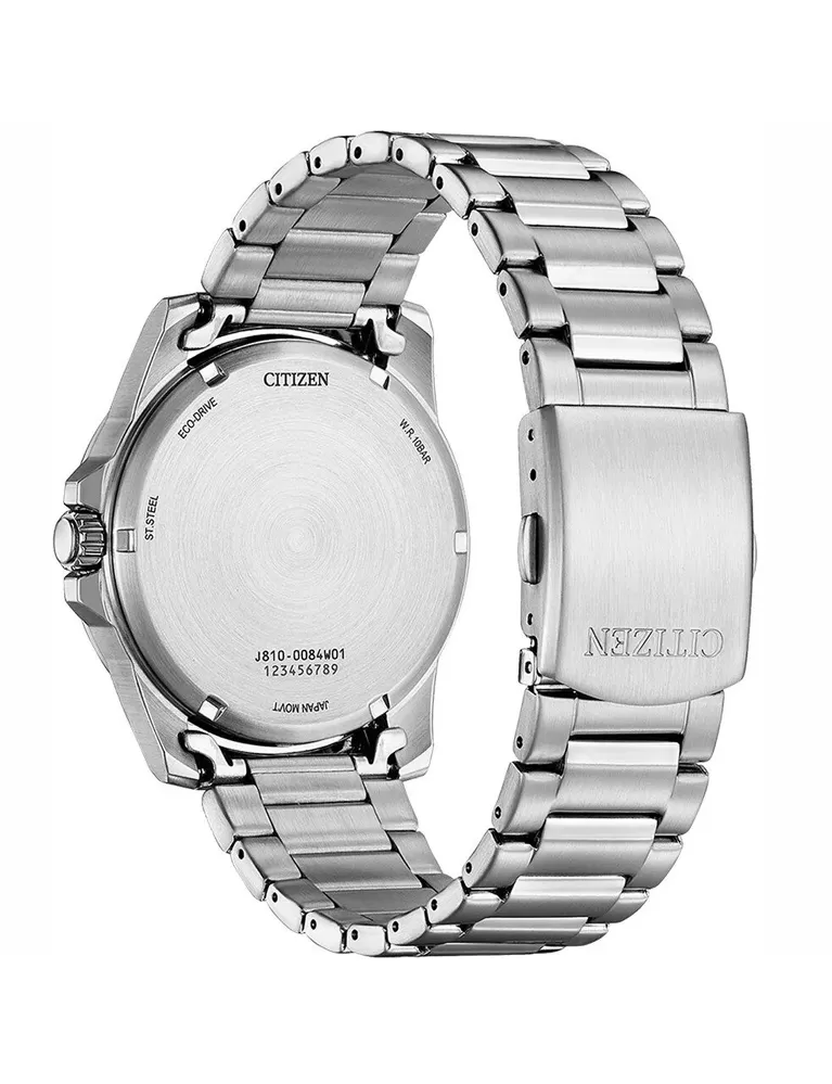Pánske hodinky Citizen Eco-Drive Sporty Marine AW1810-85L si svojich majiteľov získavajú predovšetkým svojim športovým prevedením a prehľadným dizajnom. Veľkou výhodou je pohon Eco-Drive, ktorý zaisťuje napájanie pomocou energie zo svetla, pričom odpadá nutnosť výmeny batérie. Hodinky Citizen AW1810-85L majú púzdro vrátane náramku vyrobené z ušľachtilej ocele. Vnútri puzdra sa skrýva in-house strojček Citizen J810, ktorý disponuje svetlom dobíjaným akumulátorom s rezervou chodu až 8 mesiacov a tiež funkciou indikátora vybitia akumulátora. Praktickou funkciou je potom ukazovateľ dátumu na tradičnej pozícii 3. hodiny. Ten je navyše zvýraznený lupou – tzv. "kyklopom". Prehľadný číselník tohto modelu je chránený minerálnym sklíčkom. Vodeodolnosť týchto hodiniek je 100m, bez problému teda zvládnu aj väčší kontakt s vodou, ako je plávanie. Luneta tohto modelu nie je otočná.