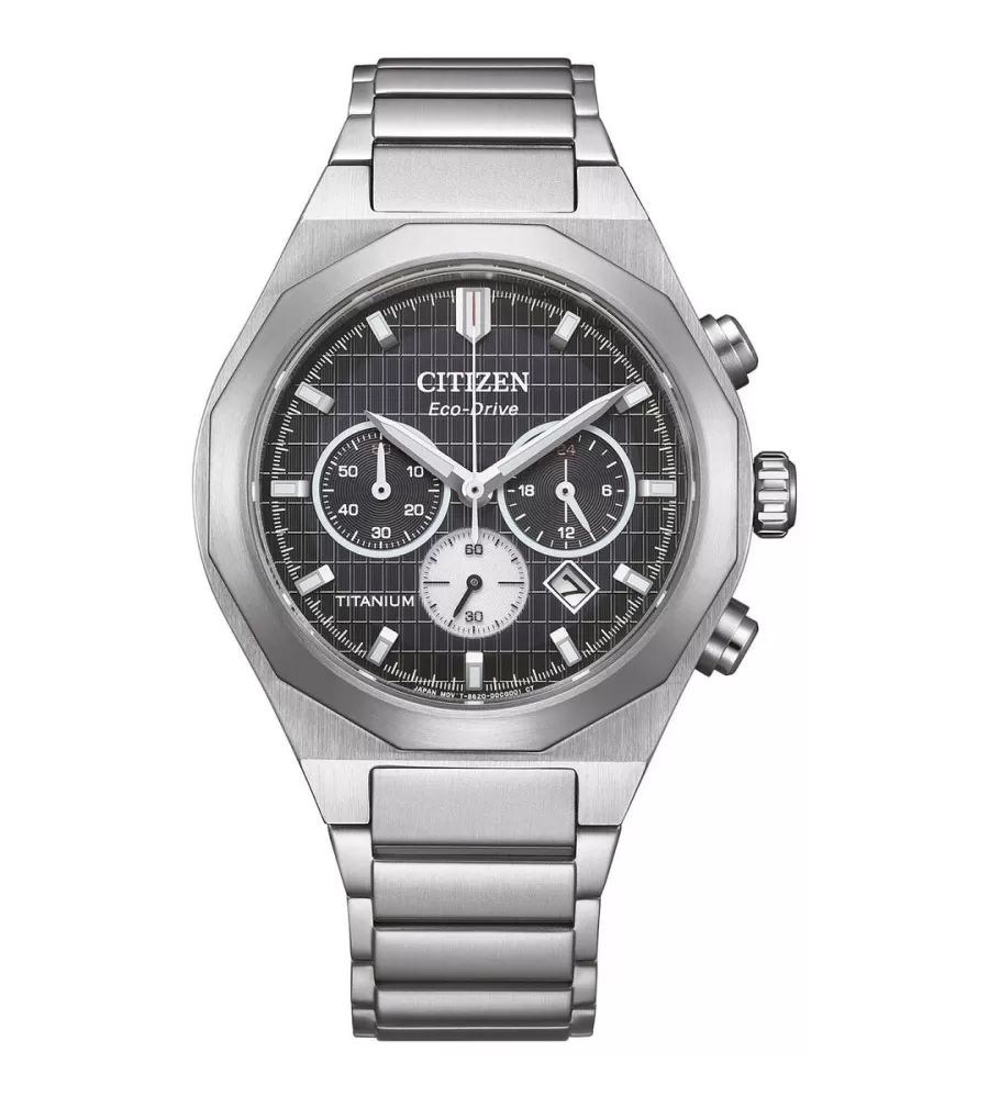 Tieto hodinky prinášajú moderný športový vzhľad kombinovaný s ľahkým a odolným super titánom, ktorý je hypoalergénny a päťkrát tvrdší ako konvenčná oceľ. Je poháňaný solárnou jednotkou Eco-Drive Solar Drive, takže čerpajú energiu zo svetla a trvajú až deväť mesiacov po úplnom nabití. Prípad má priemer 41 mm a výšku menej ako 12 mm. Salir Glass chráni čierny číselník pomocou štruktúrovaného vzoru, na ktorom traja sub -subcifters -malá sekunda, 24 -hodinová indikátor a chronograf.