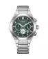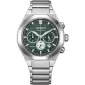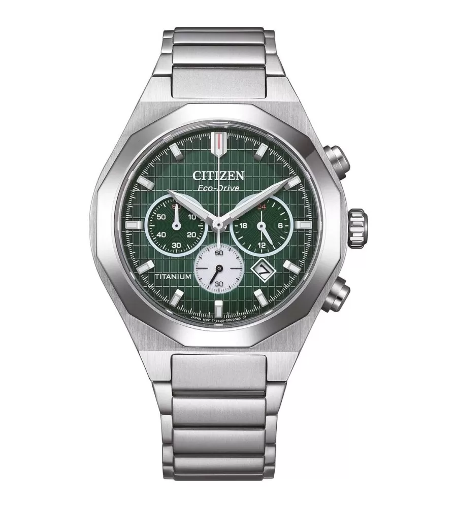 Tieto hodinky prinášajú moderný športový vzhľad kombinovaný s ľahkým a odolným super titánom, ktorý je hypoalergénny a päťkrát tvrdší ako konvenčná oceľ. Je poháňaný solárnou jednotkou Eco-Drive Solar Drive, takže čerpajú energiu zo svetla a trvajú až deväť mesiacov po úplnom nabití. Prípad má priemer 41 mm a výšku menej ako 12 mm. Sapphire Glass chráni zelený číselník so štruktúrovaným vzorom, na ktorom tri subsubcifters -malá sekunda, 24 -hodinová indikátor a chronograf.