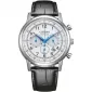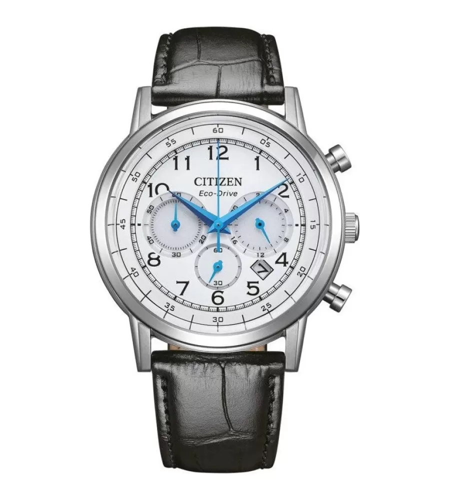 Model Citizen CA4630-02A sú pánske športovo-elegantné hodinky, ktoré kombinujú klasický vzhľad s praktickými funkciami pre každodenné nosenie. Majú puzdro z nerezovej ocele s priemerom približne 42 mm a čierny kožený remienok, ktorý zaisťuje pohodlie aj štýlový vzhľad. Dominantou je biely ciferník s výraznými arabskými číslicami a modrými ručičkami, vďaka ktorým je čas dobre čitateľný. Ciferník obsahuje aj tri subciferníky pre funkciu chronografu (stopky), 24-hodinový ukazovateľ a nechýba ani dátumovka.