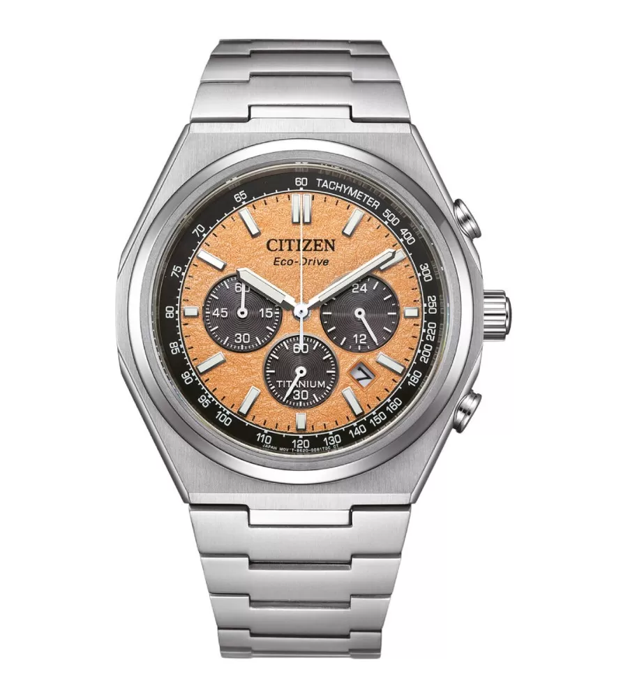 Model Citizen CA4610-85Z sú pánske športovo-elegantné hodinky z radu Super Titanium, ktoré zaujmú moderným dizajnom a výrazným lososovo (oranžovo). Puzdro aj ťah sú vyrobené z ľahkého a veľmi odolného materiálu Super Titanium™, vďaka čomu sú hodinky pohodlné na nosenie a zároveň odolnejšie ako klasická oceľ. Hodinky disponujú prehľadným ciferníkom s tromi subciferníkmi, ktoré slúžia pre funkciu chronografu (stopky), 24-hodinový ukazovateľ a meranie času. Nechýba ani dátumovka a tachymetrická stupnica po obvode ciferníka, ktorá umožňuje orientačne merať rýchlosť.