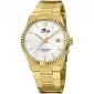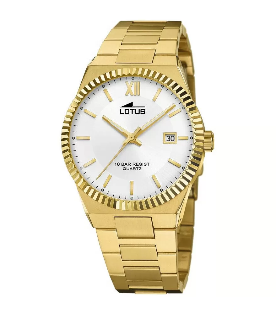 Luxusný model pánskych hodiniek Lotus v klasickom dizajne s prehľadným ciferníkom. Ciferník je v striebornej farbe disponujúcej ukazovateľom dátumu. Hodinky sú z ocele, ktorá je s PVD pozlátením vo farbe žltého zlata.