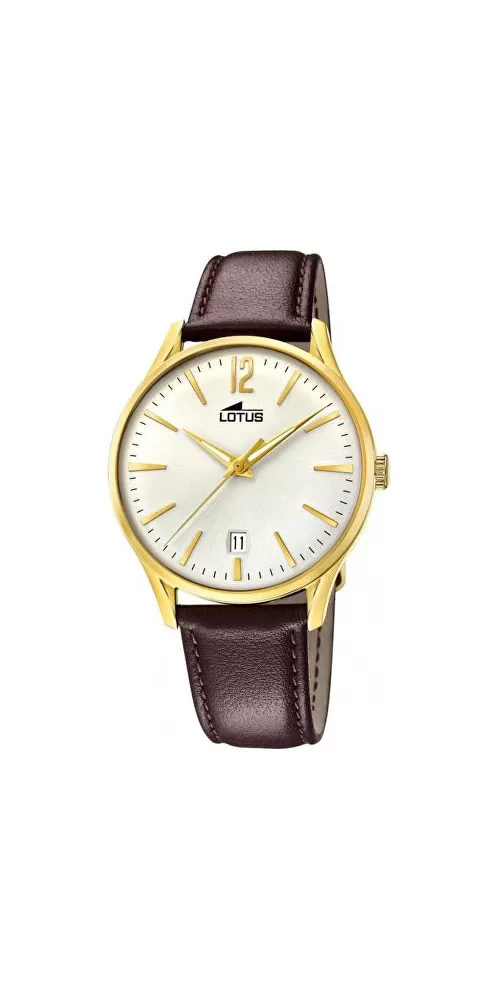 Pánske hodinky Lotus L18403/1 klasického vzhľadu patria medzi veľmi obľúbené modely. Hodinky Lotus L18403/1 majú okrúhle pozlátené, oceľové puzdro a kožený remienok. Vodotesnosť pri tomto modeli Lotus L18403/1 je 50M. Ciferník Vás prekvapí farebnosťou má k dispozícii jednoduché indexy hodín a dátum, ktorý je umiestnený na pozícii šiestich hodín.