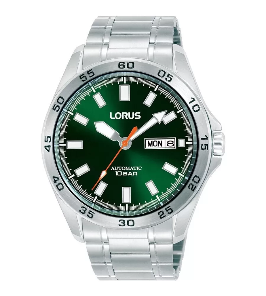 Pánske hodinky Lorus RL423CX9 zaujmú robustným športovo-elegantným dizajnom, ktorý je vhodný pre každodenné nosenie aj aktívnejší životný štýl. Okrúhle oceľové puzdro s priemerom 43 mm dopĺňa prehľadný zelený analógový ciferník s luminiscenčnými ručičkami a indexmi, vďaka ktorým je čas ľahko čitateľný aj za zhoršených svetelných podmienok. Minerálne sklíčko chráni ciferník pred poškriabaním a priehľadné dynko umožňuje pohľad na spoľahlivý mechanický strojček s automatickým náťahom. Oceľový ťah pôsobí pevne, komfortne sa nosí a podčiarkuje celkovo kvalitné spracovanie hodiniek. Vodotesnosť 10 ATM umožňuje bezstarostné používanie pri bežnom kontakte s vodou, sprchovaní aj plávaní, zatiaľ čo praktické funkcie zobrazenia dátumu a dňa v týždni zvyšujú každodennú využiteľnosť tohto modelu.
