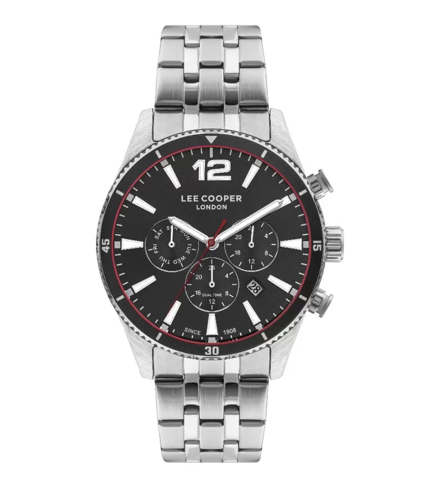 Lee Cooper LC07641.350 je mužské analógové hodinky s okrúhlym kovovým puzdrom s priemerom 44 mm v striebornej farbe. Majú strieborný kovový ťah a čierny číselník s dvanástimi klasickými indexmi pod minerálnym sklom. Jednotka je zabezpečená batériou, existuje aj dátový displej a vodotesný do hĺbky 30 metrov, čo je dostatočné na neformálne opotrebenie.