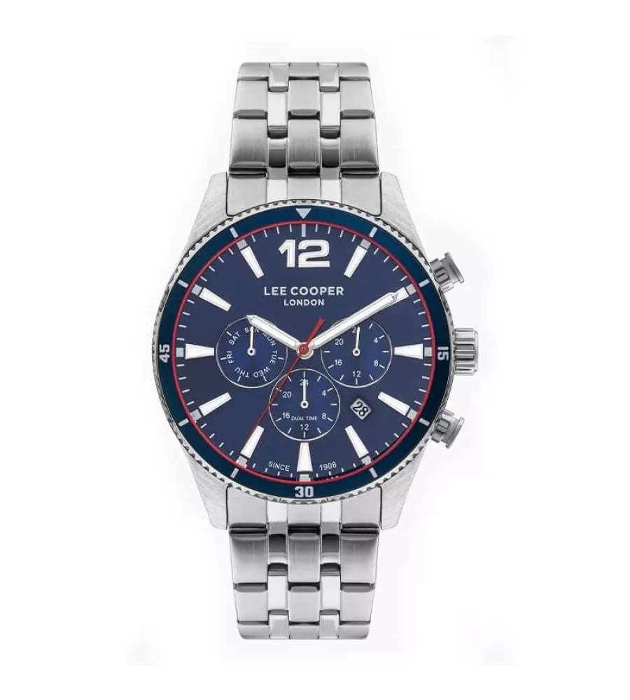 Lee Cooper sú pánske hodinky s veľkým kovovým puzdrom s priemerom približne 44 mm v elegantnej kombinácii striebornej modrej farby. Majú kremeňový chronografický pohyb s funkciami Dátum, deň a 24 -hodinový čas. Sú vybavené kovovým náramkom, minerálnym sklom a nepremokavým až do 5 atm, takže sú vhodné pre normálne denné opotrebenie a športový štýl.