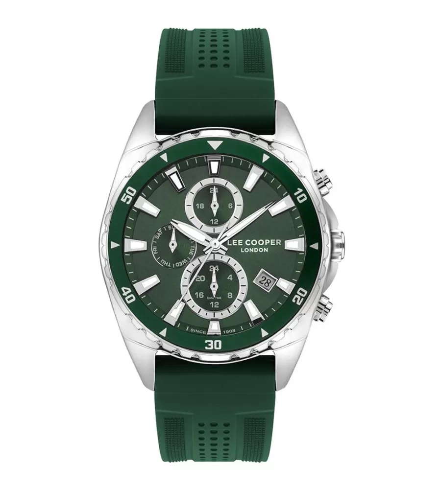 Výrazný model pánskych športových hodiniek zaujme veľmi veľa mužov. Hodinky majú okrúhle puzdro z kvalitného kovu, ktoré poháňa spoľahlivých strojček a batérie s dvojročnou životnosťou. Zelený číselník má k dispozícii dátum, umiestnený na pozícii štvrtej hodinky. Tiež chronograf, ktorý určite využijete. Tento model dopĺňa remienok zo silikónu, ktorý dokonale priľne k zápästiu.