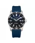 Nápadný športový model pre mužov vám nesmie chýbať. Okrúhle púzdro aj s priemerom 42 mm zdobí čierna luneta a modrý ciferník s výraznými indexmi, ktoré sú potiahnuté luminiscenčnou vrstvou. Poteší vás dátumovka na pozícii tretej. Celý model dopĺňa modrý silikónový remienok a kovová pracka. Hodinky sú vhodné na každodenné nosenie.