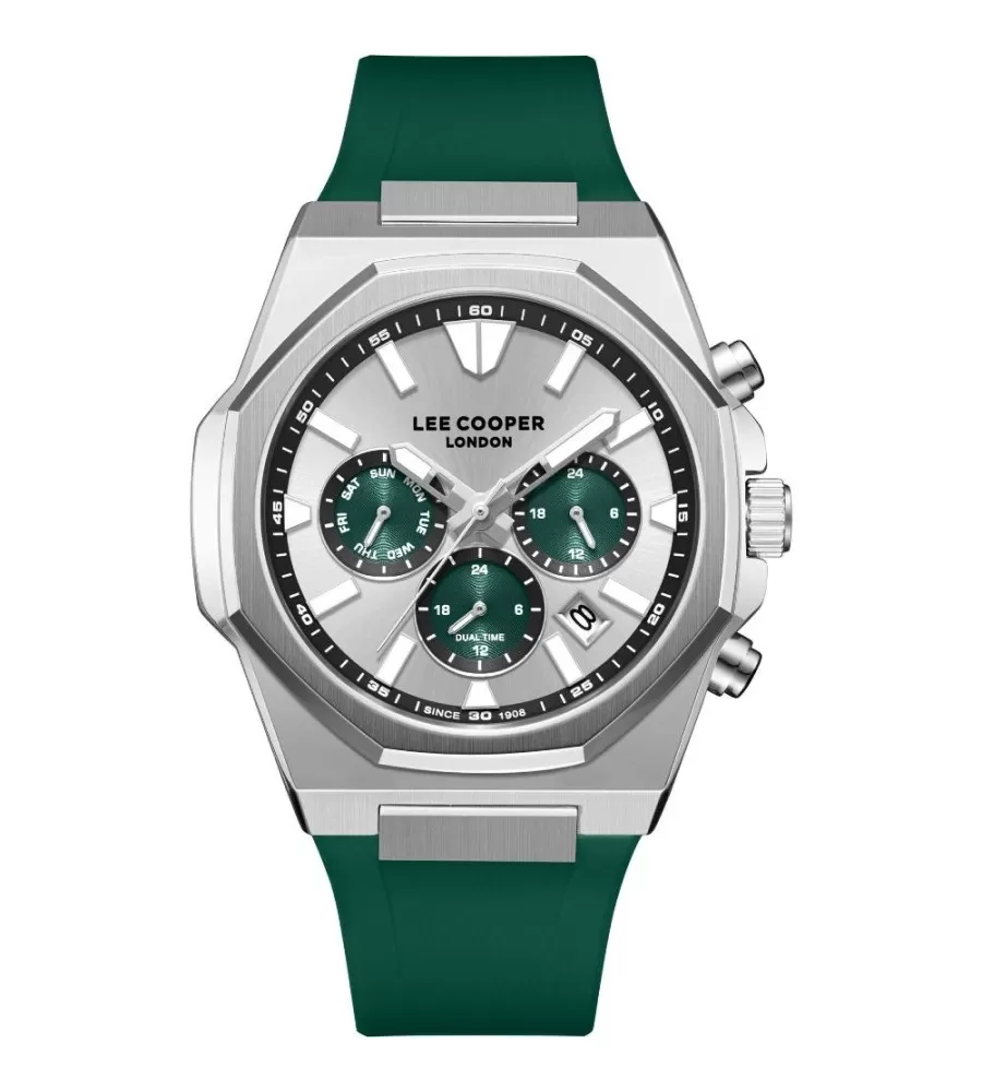 Pánské náramkové hodinky mají osmihranné pouzdro vyrobeno z kvalitního kovu o průměru 44 mm. Zaujme Vás přehledný číselník ve stříbrné barvě, který má k dispozici datum a dny v týdnu. Pánský model doplňuje silikonový řemínek, který je velmi oblíbený pro svou pohodlnost, například při sportu. Hodinky jsou vhodné pro každodenní nošení.