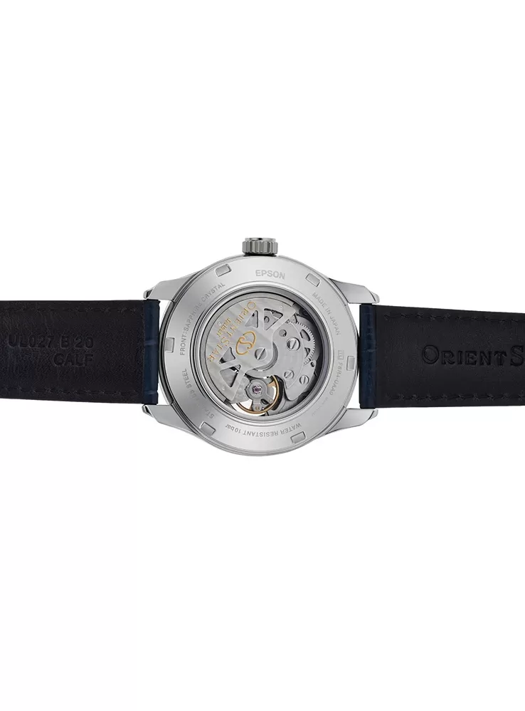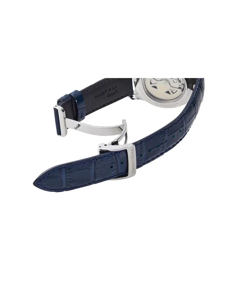 Orient Star RE-AT0006L00B sú neuveriteľne štýlové hodinky, ktoré sa veľmi dobre hodia takmer na každú príležitosť. Puzdro je vyrobené z nerezovej ocele a je v kombinácii s pohodlným modrým koženým remienkom. Hodinky majú indikátor rezervy chodu na pozícii 12 a „otvorené srdce“ na pozícii 9. Cez tento otvor na modrom ciferníku môžete sledovať bežiaci pohyb strojčeka.
