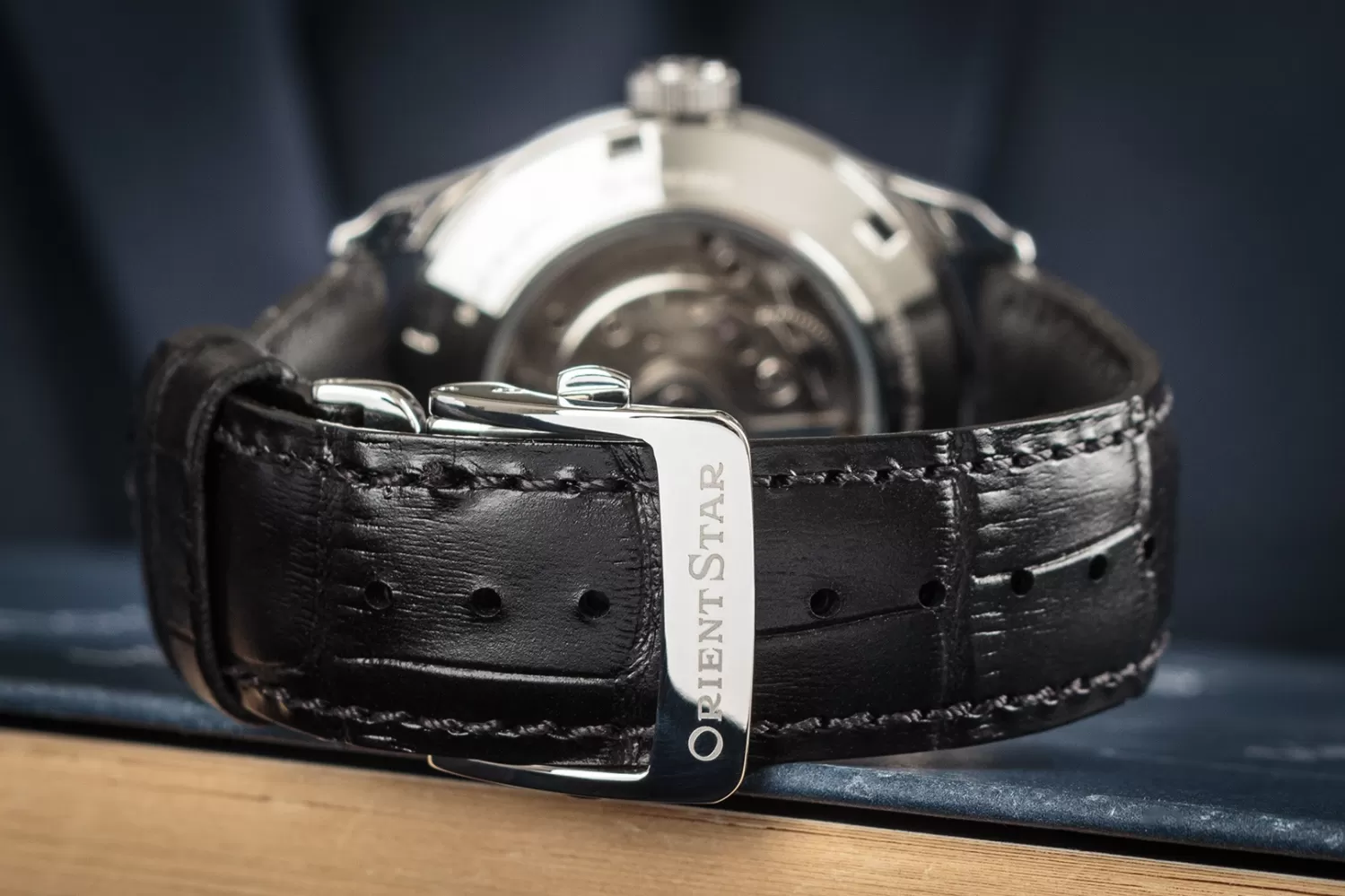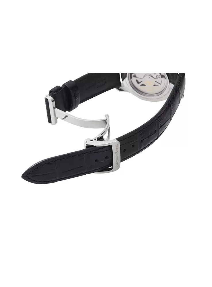 Orient Star RE-AT0007N00B sú neuveriteľne štýlové hodinky, ktoré sa veľmi dobre hodia takmer pre každú príležitosť. Puzdro je vyrobené z nerezovej ocele a je v kombinácii s pohodlným čiernym koženým remienkom. Hodinky majú indikátor rezervy chodu na pozícii 12 a „otvorené srdce“ na pozícii 9. Cez tento otvor na čiernom ciferníku môžete sledovať bežiaci pohyb strojčeka.