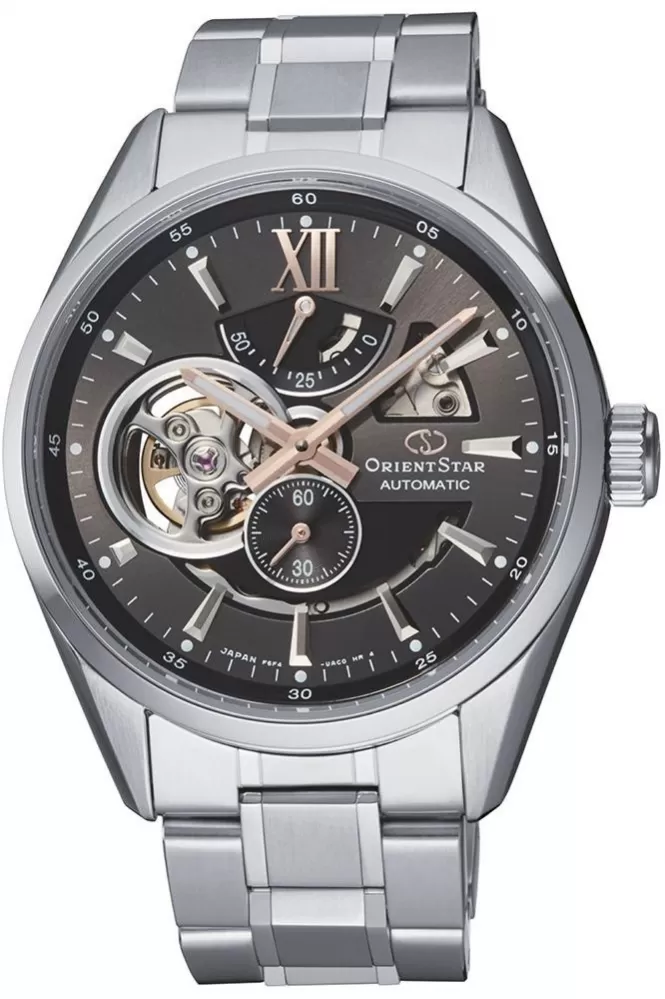 Pánske elegantné hodinky Orient Star RE-AV0004N00B z kolekcie "Contemporary Semi-Skeleton Automatic" sa budú hodiť do spoločnosti aj na každodenné nosenie Púzdro a remienok je vyrobené z nerezovej ocele, ktorá vyniká svojou farebnou stálosťou a vysokou odolnosťou. Hodinky majú indikátor rezervy chodu na pozícii. 12 a „otvorené srdce“ na pozícii 9. Cez tento otvor na čiernom ciferníku môžete sledovať bežiaci pohyb strojčeka. Nájdete tu aj samostatný subciferník pre sekundovú ručičku.