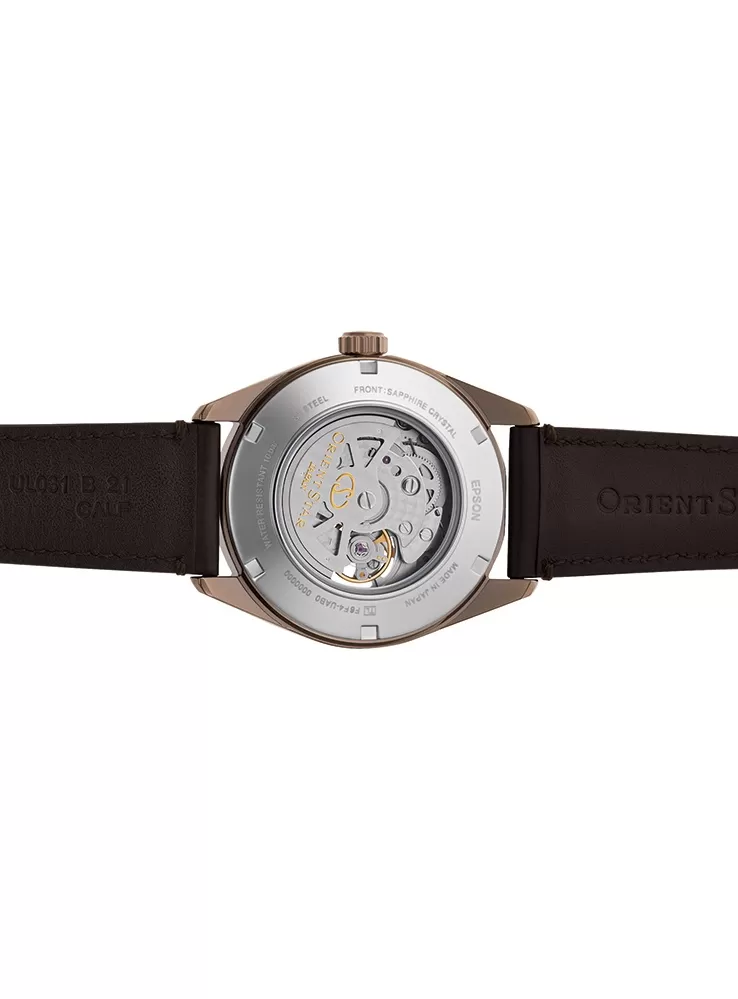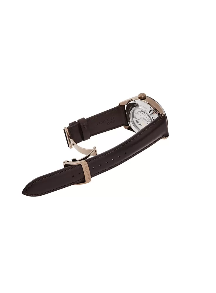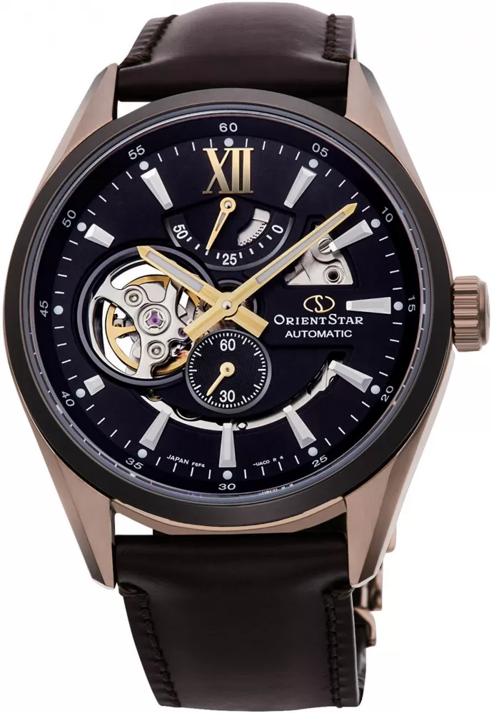 Pánske elegantné hodinky Orient Star RE-AV0115B00B z kolekcie "Contemporary Semi-Skeleton Automatic" sa budú hodiť do spoločnosti aj na každodenné nosenie. Puzdro je vyrobené z nerezovej ocele s PVD pozlátením vo farbe ružového zlata a to je v kombinácii s koženým remienkom v hnedej farbe. Hodinky majú indikátor rezervy chodu na pozícii 12 a „otvorené srdce“ na pozícii 9. Cez tento otvor na čiernom ciferníku môžete sledovať bežiaci pohyb strojčeka. Nájdete tu aj samostatný subciferník pre sekundovú ručičku.