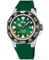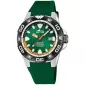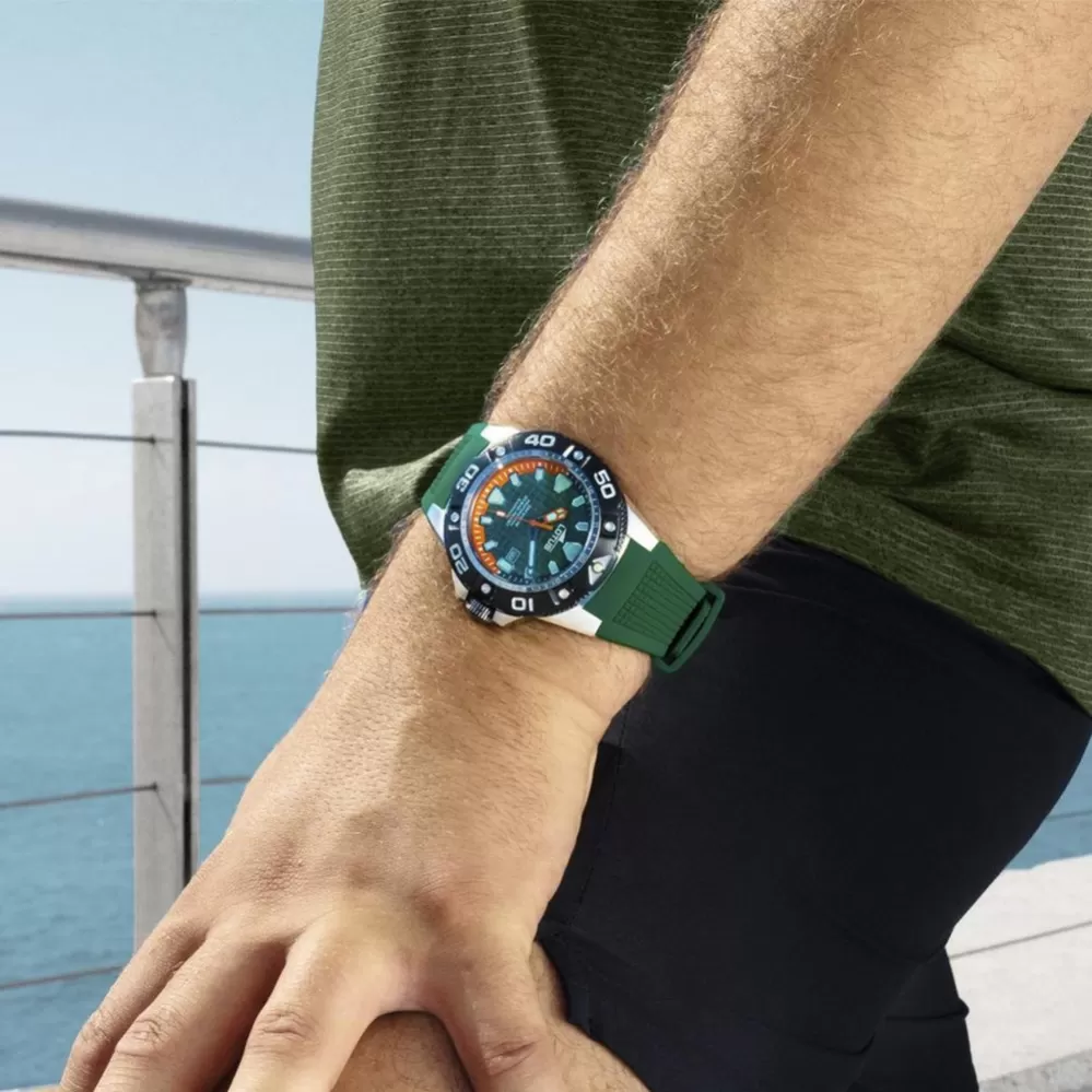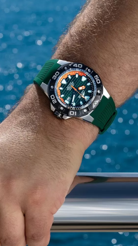 Športové pánske quartzové hodinky na gumovom remienku disponujúce vodotesnosťou 200 metrov. Zelený číselník s oranžovými detailmi je chránený zafírovým sklom a oceľovým puzdrom. Zafírové sklo chráni hodinky pred poškriabaním, zatiaľ čo oceľové puzdro s čiernou PVD úpravou zaisťuje ich odolnosť a dlhú životnosť. Tento model je perfektný pre aktívnych mužov, ktorí potrebujú hodinky schopné vydržať aj náročnejšie podmienky.