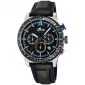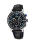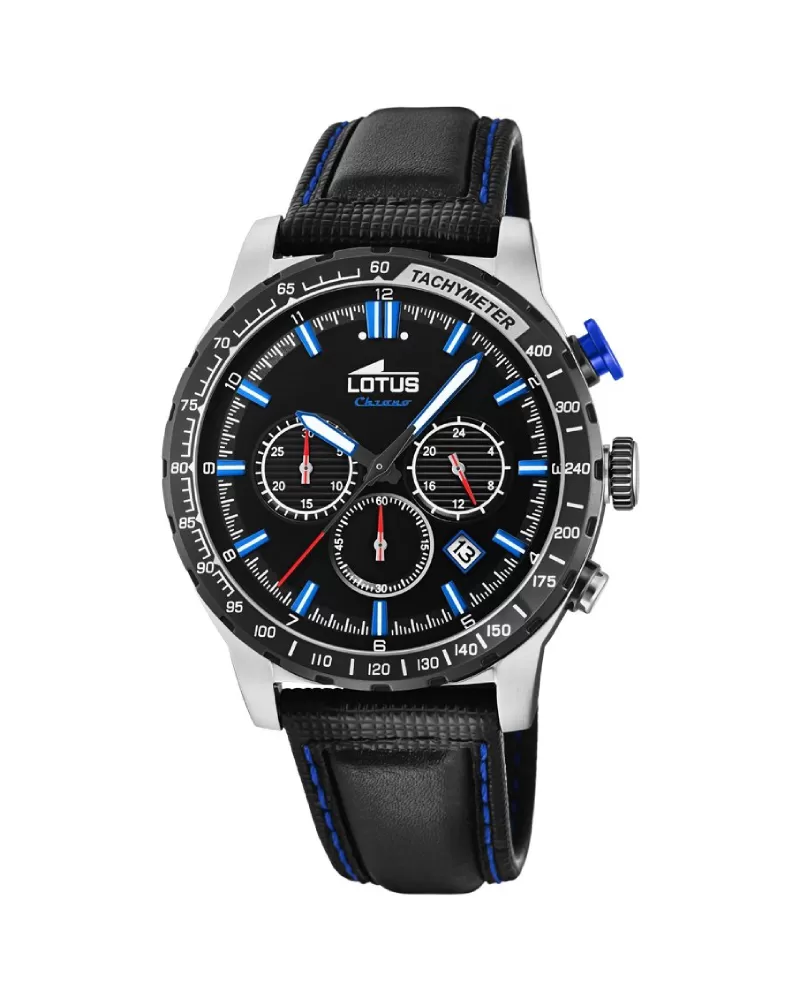 Športový model hodiniek v čiernom prevedení zaujme červenými rúčkami s modrými indexmi a modrým tlačidlom k stopkám. Biele číselníky na čiernom pozadí nechajú vyniknúť celkovému dizajnu. Hodinky sú doladené čiernym koženým remienkom s modrým prešitím.