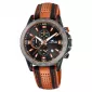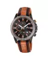 Štýlové športové hodinky pre náročných mužov, originálneho dizajnu. Puzdro hodiniek v čiernom prevedení s šedivou číselnou lunetou, s oranžovými prvkami v číselníku hodiniek. Remienok je oranžový s čiernymi prúžkami športového charakteru.