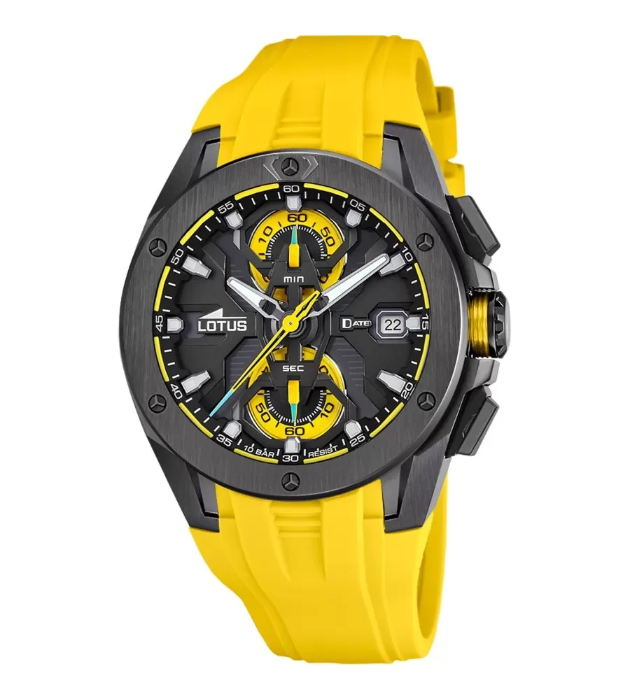 Lotus Lotus L18943/1 sú štýlové pánske hodinky zo série Vortex, ktoré kombinujú športový vzhľad s praktickými funkciami. Puzdro z nehrdzavejúcej ocele s čiernym PVD má priemer 44 mm s hrúbkou asi 13,4 mm, čo dáva hodinám robustný a moderný charakter. Na čiernom číselníku nájdeme chronograf s dvoma výraznými žltými podaniami a malým dátumovým oknom v tretej hodinovej polohe. Indikátor hodín a minút sú strieborné a luminiscenčné, druhá ruka je žltá. Všetky prvky sú ľahko čitateľné a dynamické. Popruh je vyrobený z odolnej gumy s klasickou prackou.