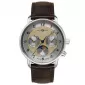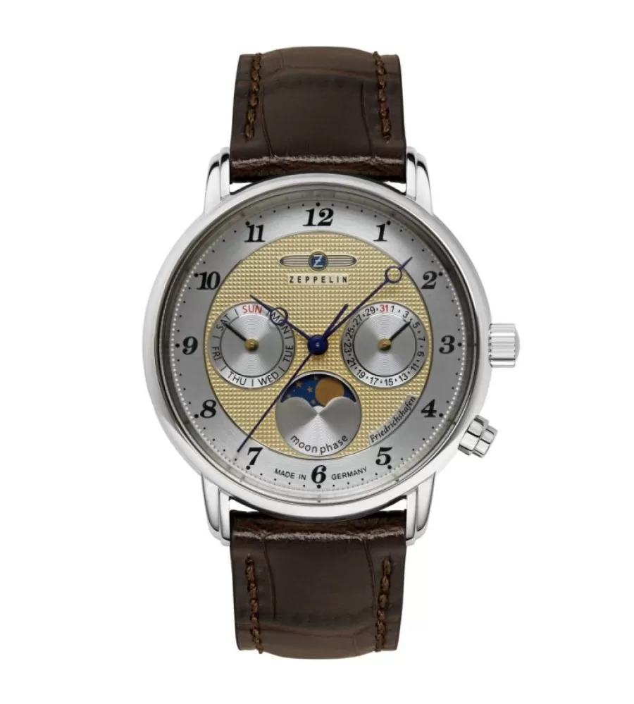 Hodinky Zeppelin 8537-5 Friedrichshafen sú elegantný dámsky model v klasickom spoločenskom štýle. Ciferník v strieborno-zlatom prevedení zdobia jemné detaily a prehľadné arabské číslice, ktoré zaisťujú dobrú čitateľnosť. Dominantným prvkom je ukazovateľ mesačnej fázy, ktorý dodáva hodinkám luxusný a sofistikovaný vzhľad. Model ďalej ponúka praktické zobrazenie dátumu, čo zvyšuje jeho každodennú využiteľnosť. Púzdro z nerezovej ocele je doplnené kvalitným hnedým koženým remienkom pre pohodlné nosenie.